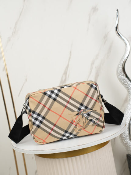 Burberry Check Camera Bag with Equestrian Knight Emblem Beige Style