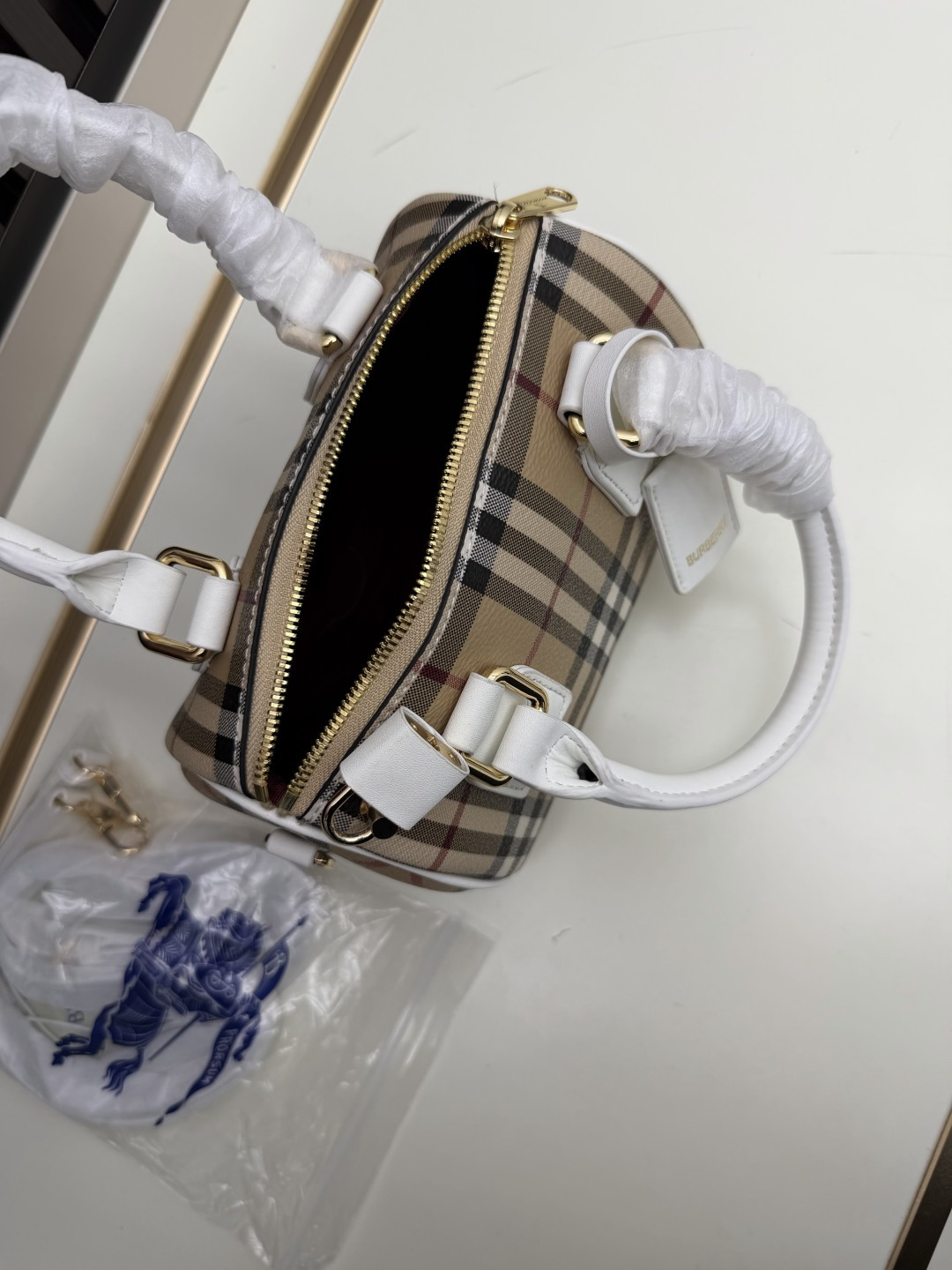 Be the first to review “Burberry Latest Style Birch Brown Check Bowling Bag Mini Size White Handle” Cancel reply