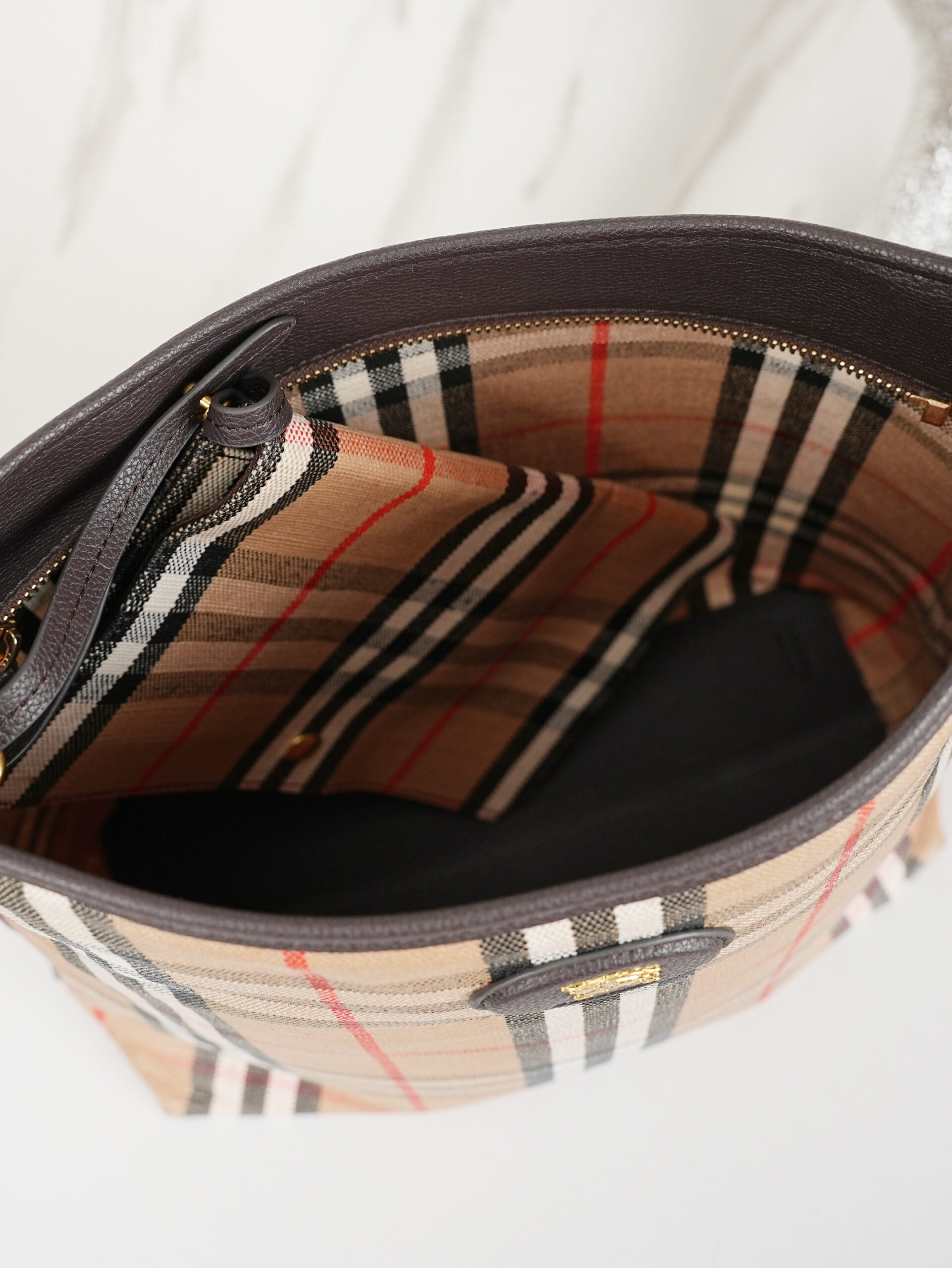 Burberry’s latest tote bag is crafted from a cotton-linen blend, trimmed with smooth calfskin leather. It features jacquard-woven Burberry check and a trench coat-inspired coated finish. The unlined design comes with a slim shoulder strap, accented with the Knight Patch—a vintage pattern from the brand’s 1980s bag collections.