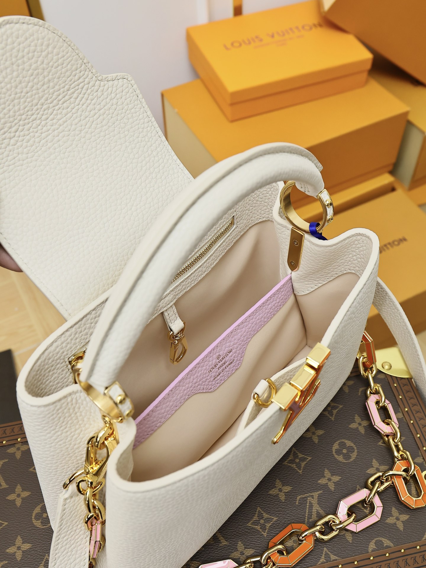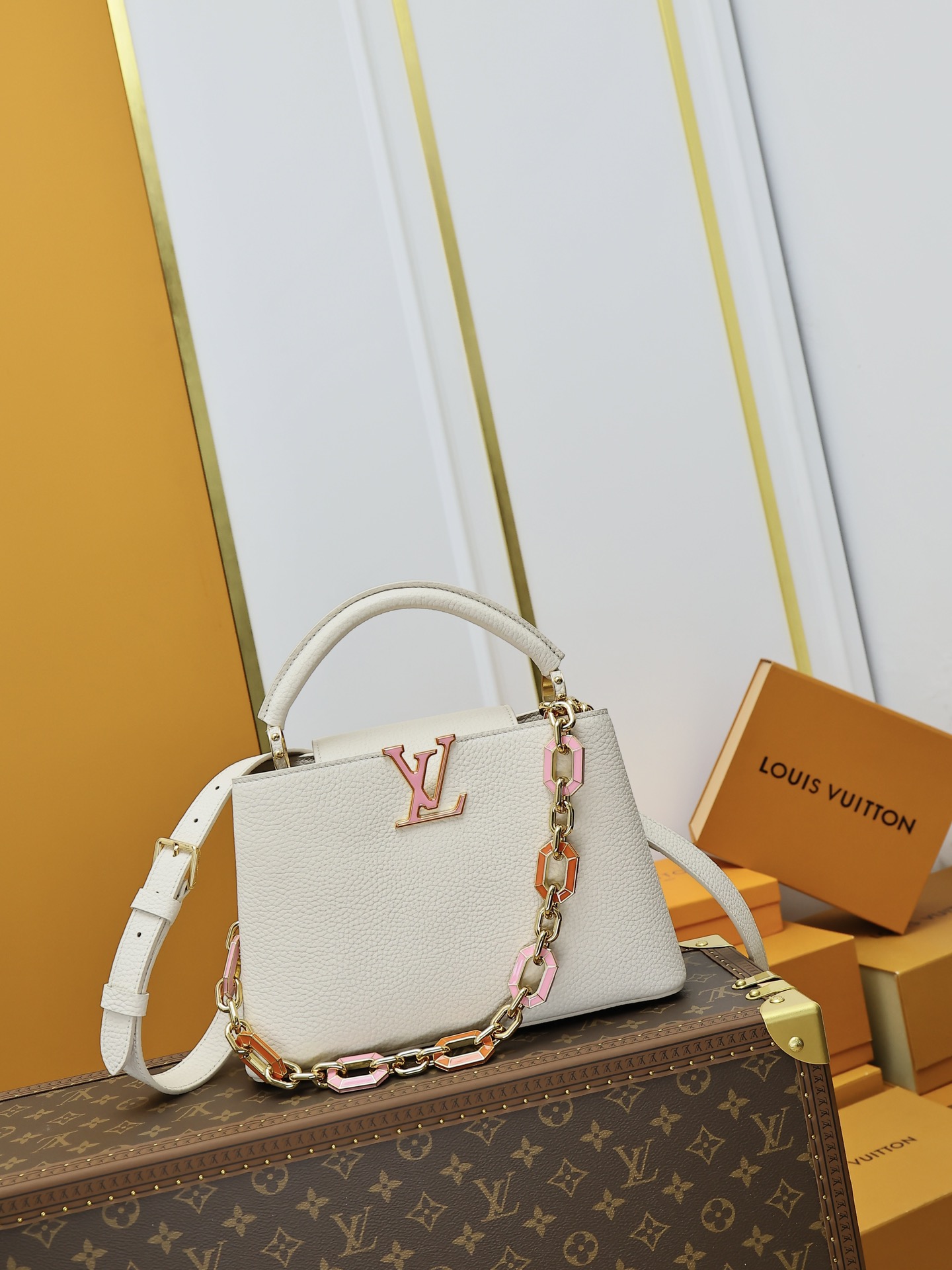 Be the first to review “Louis Vuitton CAPUCINES Handbag White with pink logo” Cancel reply